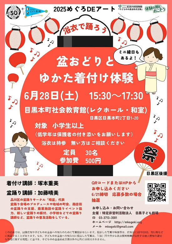 対象は小学生以上で、低学年は保護者の付き添いをお願いします。浴衣は持参してください。無い方はご相談ください。定員は30名で、参加費は500円です。着付け講師は塚本重美さん、盆踊り講師は品川区の盆踊りサークル「晴盆」代表の加藤晴美さんです。お申し込みはQRコードまたはHPからお願いします。締切は6月21日で、応募多数の場合は抽選となります。この活動では、団体広報や子どもゆめ基金への報告のために写真撮影を行います。撮影した写真や映像等は、広報にHPやSNS、刊行物などに掲載することがあります。