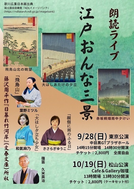 朗読ライブ 江戸おんな三景 飛鳥山北の眺望 演目は「飛鳥山」、「桐畑に雨のふる日」、「大はし夕立少女ち」。 14時15分開場 14時30分開演 チケット: 2,800円 全席自由