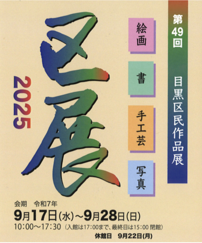 第49回目黒区民作品展が開催されます。展示内容は絵画、書、手工芸、写真です。会期は令和7年9月17日(水)から9月28日(日)までで、開館時間は10:00から17:30まで(入館は17:00まで)、最終日は15:00に閉館します。9月22日(月)は休館日です。