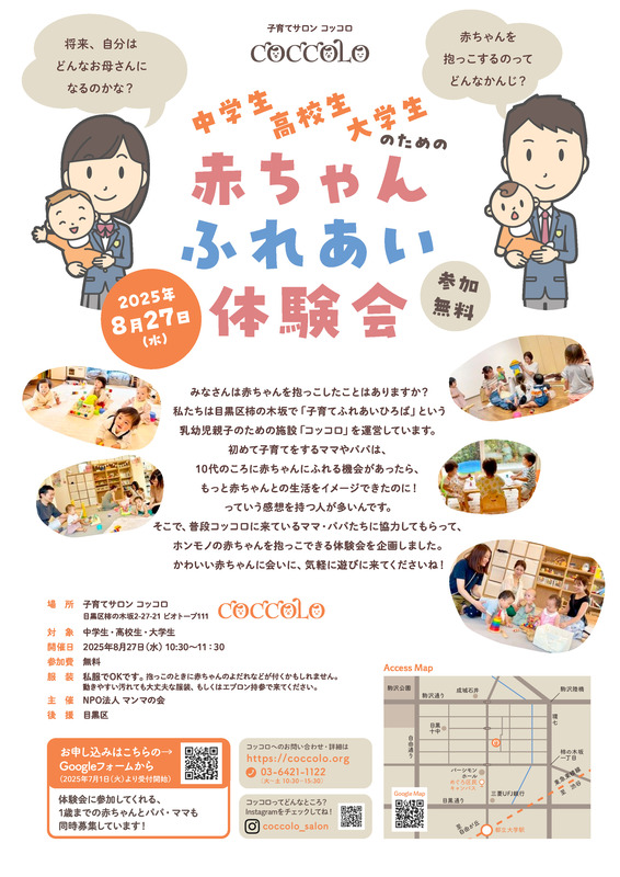 みなさんは赤ちゃんを抱っこしたことはありますか? 私たちは目黒区柿の木坂で「子育てふれあいひろば」という乳幼児親子のための施設「コッコロ」を運営しています。初めて子育てをするママやパパは、10代のころに赤ちゃんにふれる機会があったら、もっと赤ちゃんとの生活をイメージできたのに!っていう感想を持つ人が多いんです。そこで、普段コッコロに来ているママ・パパたちに協力してもらって、ホンモノの赤ちゃんを抱っこできる体験会を企画しました。かわいい赤ちゃんに会いに、気軽に遊びに来てくださいね! 対象は中学生・高校生・大学生で、参加費は無料です。服装は私服でOKですが、抱っこのときに赤ちゃんのよだれなどが付くかもしれませんので、動きやすい汚れても大丈夫な服装、もしくはエプロン持参で来てください。体験会に参加してくれる、1歳までの赤ちゃんとパパ・ママも同時募集しています!