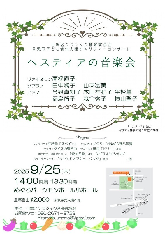 目黒区クラシック音楽家協会が主催する、目黒区子ども食堂支援のためのチャリティーコンサート「ヘスティアの音楽会」が開催されます。出演者にはヴァイオリンの高橋直子、ソプラノの田中純子、山本富美、ピアノの今泉真知子、木田左和子、平松薫、福島智子、森合爽子、横山聖子が名を連ねます。プログラムにはシャプリエの「狂詩曲『スペイン』」、ショパンの「ノクターンNo20嬰ハ短調」、マスネの「タイスの瞑想曲」、フォーレの「組曲『ドリー』より」、木下牧子とやなせたかしの「愛する歌」より“さびしいカシの木”、ハマースタインⅡの「サウンドオブミュージック」より、