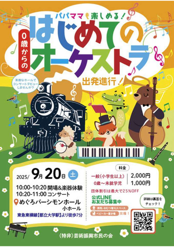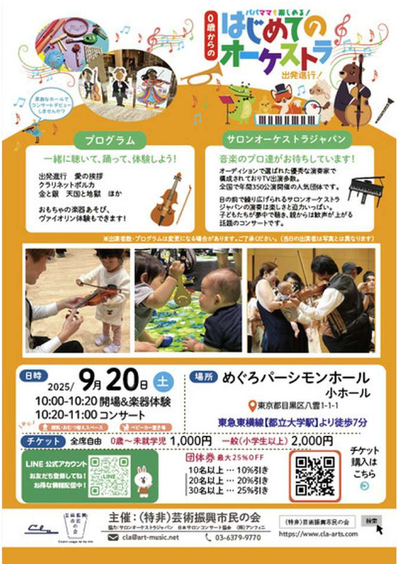 サロンオーケストラジャパンによる、0歳から楽しめるコンサートです。一緒に聴いて、踊って、体験しよう! 音楽のプロ達がお待ちしています。おもちゃの楽器あそびやヴァイオリン体験もあります。全国で350公演の人気団体による、楽しさと迫力いっぱいのコンサートです。出演者プログラムは変更になる場合があります。ご了承ください。開場&楽器体験は10:00から、コンサートは10:20から始まります。チケットは全席自由で、0歳~未就学児は1,000円、一般(小学生以上)は2,000円です。団体券は最大25%OFFです。
