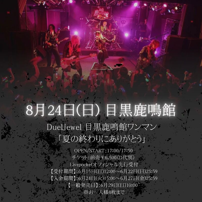 DuelJewelによる目黒鹿鳴館でのワンマンライブ「夏の終わりにありがとう」が開催されます。開場は17:00、開演は17:30です。チケットは前売り6,500円(D代別)で、Livepocketオフィシャル先行受付が行われます。受付期間は6月15日(日)12:00から6月22日(日)23:59まで、入金期間は6月24日(火)13:00から6月27日(金)23:59までです。一般発売日は6月29日(日)10:00からで、お一人様4枚まで購入可能です。