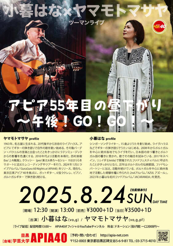 小暮はなとヤマモトマサヤによるツーマンライブが開催されます。開場は12:30、開演は13:00です。前売りチケットは3000円+1ドリンク、当日は3500円+1ドリンクです。ライブ配信も行われ、APIA40オフィシャルYouTubeチャンネルで視聴可能です。配信料金はドネーション形式で、一口2000円からです。
