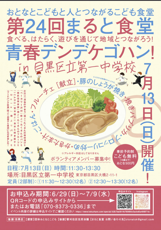 おとなとこどもと人とつながるこども食堂「第24回まると食堂」が開催されます。食べる、はたらく、遊びを通じて地域とつながりましょう。献立には豚のしょうが焼き、かきたま汁、フルーチェなどが予定されています。フードバンク目黒様よりお菓子、Dole様よりバナナ、ICARO宮本様よりお米と焼き菓子、西武信用金庫様よりたくさんのフルーツ、ベーカリー沢村様よりたくさんのパン、漬物やまう様よりたくさんの福神漬けが提供されます。事前予約制で、アレルギー対応はしておりません。こどもは無料、おとなは500円です。ボランティアメンバーも募集中です。定員は2部制で、①11:30~12:30(12名)、②12:30~13:30(12名)です。お申込み期間は6月29日から7月9日までです。