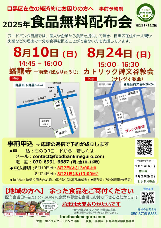 メール: contact@foodbankmeguro.com電話: 070-6991-6687 (月-金10-16時)
