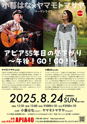 小暮はなとヤマモトマサヤによるツーマンライブ「アピア55年目の昼下がり〜午後! GO! GO」が開催されます。出演は小暮はな (vo.g) とヤマモトマサヤ (vo.p.pfy) です。ライブは13:00から始まります。チケットは前売り3000円+1ドリンク、当日3500円+1ドリンクです。APIA40の公式YouTubeチャンネルでも配信され、視聴料は2000円です。
