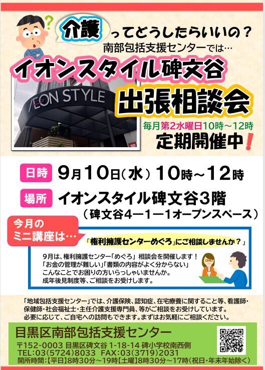 南部包括支援センターでは、毎月第2水曜日に定期的に出張相談会を開催しています。今月のミニ講座は「権利擁護センターめぐろ」にご相談しませんか?成年後見制度等についての相談を受け付けています。介護保険、認知症、在宅療養に関する相談も可能です。必要に応じてご自宅への訪問も行っています。