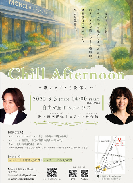 午後のひととき チルな時間を過ごしませんか? 歌とピアノが織りなす音楽時間。終演後はグラス片手に小さな乾杯を。演奏予定曲はシューベルト「ガニュメート」「羊飼いの嘆きの歌」、シューマン「献呈」「我が苦悩の美しい揺かご」、リスト「愛の夢 第3番」ほか。演奏は約1時間・休憩なしでお届けします。チケットはコンサートと乾杯が4,500円、コンサートのみが4,000円です。