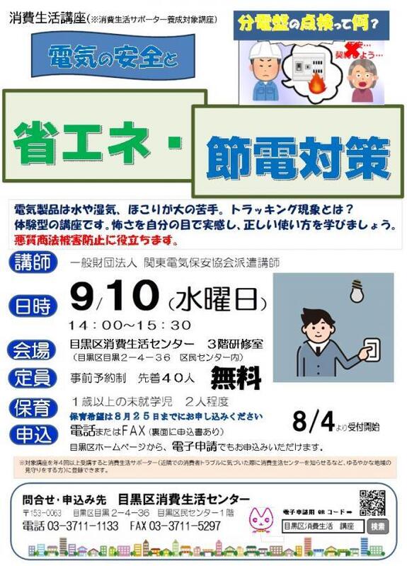 電気製品は水や湿気、ほこりが大の苦手。トラッキング現象とは? 体験型の講座です。怖さを自分の目で実感し、正しい使い方を学びましょう。悪質商法被害防止に役立ちます。講師は一般財団法人 関東電気保安協会派遣講師です。事前予約制で先着40人、無料です。1歳以上の未就学児2人程度の保育もあります。保育希望は8月25日までにお申し込みください。8月4日より受付開始。目黒区ホームページから、電子申請でもお申込みいただけます。対象講座を年4回以上受講すると消費生活サポーターに登録できます。
