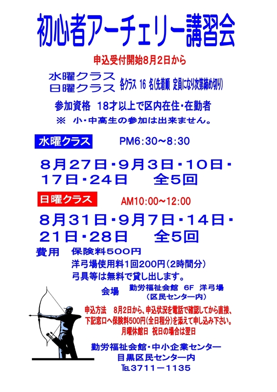 初心者アーチェリー講習会の水曜クラスが開催されます。参加資格は18才以上で区内在住・在勤者です。小・中高生の参加は出来ません。講習は全5回で、8月27日から9月24日まで毎週水曜日のPM6:30から8:30に行われます。費用は保険料500円と洋弓場使用料1回200円(2時間分)です。弓具等は無料で貸し出します。申込は8月2日から開始され、申込状況を電話で確認してから直接窓口へ保険料500円を添えて申し込みください。月曜休館日(祝日の場合は翌日)。
