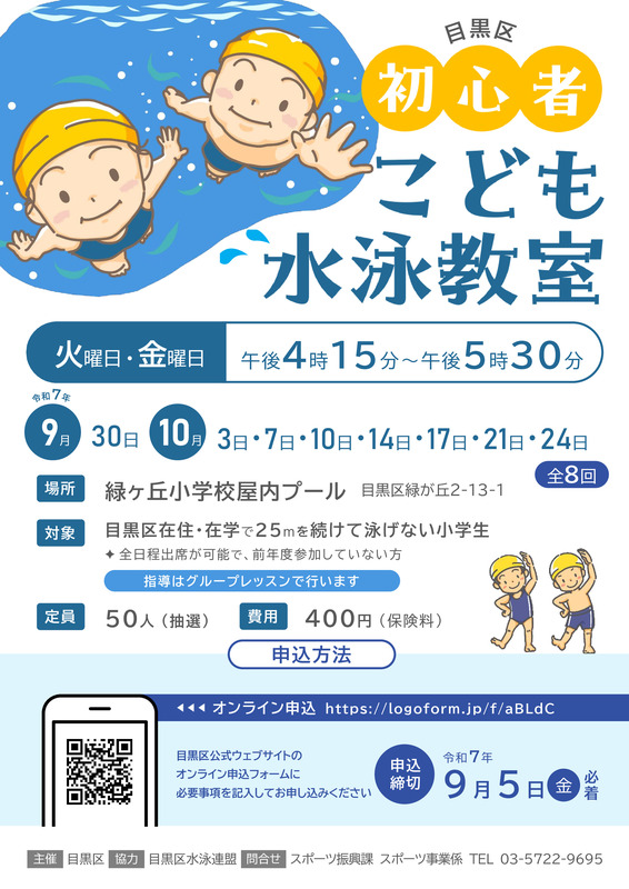 目黒区在住・在学で25mを続けて泳げない小学生を対象にした初心者こども水泳教室を開催します。全8回のグループレッスンで、火曜日と金曜日の午後4時15分から午後5時30分まで行います。定員は50人で、費用は保険料として400円です。全日程出席が可能で、前年度参加していない方が対象です。申込はオンラインで、締切は9月5日(金)必着です。