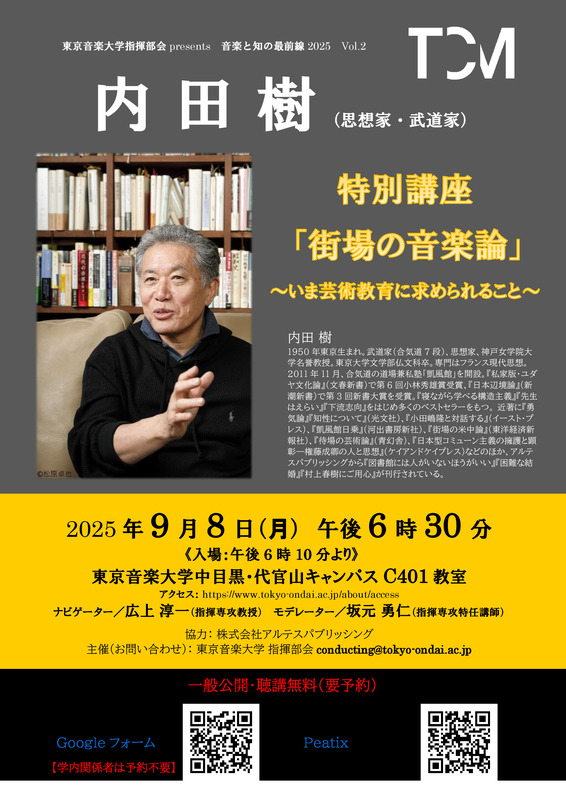 東京音楽大学指揮部会が主催する特別講座「街場の音楽論」が開催されます。講師は思想家・武道家の内田樹氏で、芸術教育に求められることについて講演します。内田氏は合気道7段であり、神戸女学院大学名誉教授でもあります。一般公開で聴講無料ですが、予約が必要です。学内関係者は予約不要です。