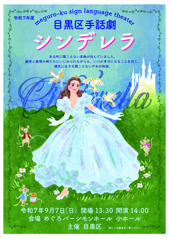 令和7年度目黒区手話劇「シンデレラ」が開催されます。聞こえない少女の物語を手話で魅せる公演です。全編手話での公演となり、日本語字幕も付きます。鑑賞は無料で全席自由、先着150名です。お申込みはメールフォームにて24時間受付。申込期間は令和7年8月18日 (月) 午前10時から令和7年9月3日 (水) 午後6時までです。会場はめぐろパーシモンホール小ホールです。公共交通機関のご利用をお願いいたします。