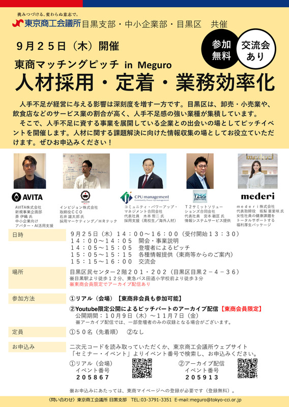 東京商工会議所目黒支部・中小企業部・目黒区共催の「東商マッチングピッチ in Meguro」が開催されます。人材採用・定着・業務効率化をテーマにしたピッチイベントで、人手不足に資する事業を展開している企業との出会いの場を提供します。参加は無料で、交流会もあります。リアル会場での参加と、東商会員限定のYoutubeアーカイブ配信があります。アーカイブ配信は10月9日から11月7日まで公開されます。参加方法は、東京商工会議所ウェブサイトからイベント番号で検索し、お申込みください。